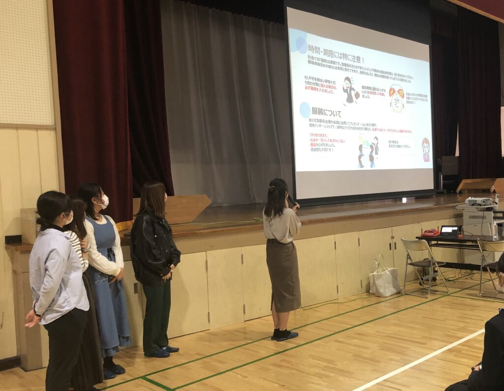 私はクッション言葉や敬語の内容について説明しました。就職活動やアルバイトで敬語を使う機会は多くありますが、今回のマナー講座を通して自分自身も敬語などについて見直す必要があると感じました。また、中学生と関わる機会はあまりないので貴重な経験にもなりました。(太田優菜)