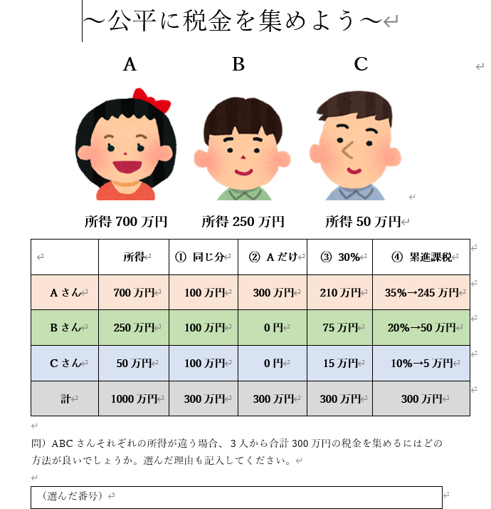・『税金の集め方を知れたのがよかった。「公平」か、それとも「平等」かが税金の種類によって違い、面白かったです。また国の借金は本当に返せるのだろうか、とよく思う。税金は私たちが生活するためになくてはならないものだから、真剣に向き合っていきたい』