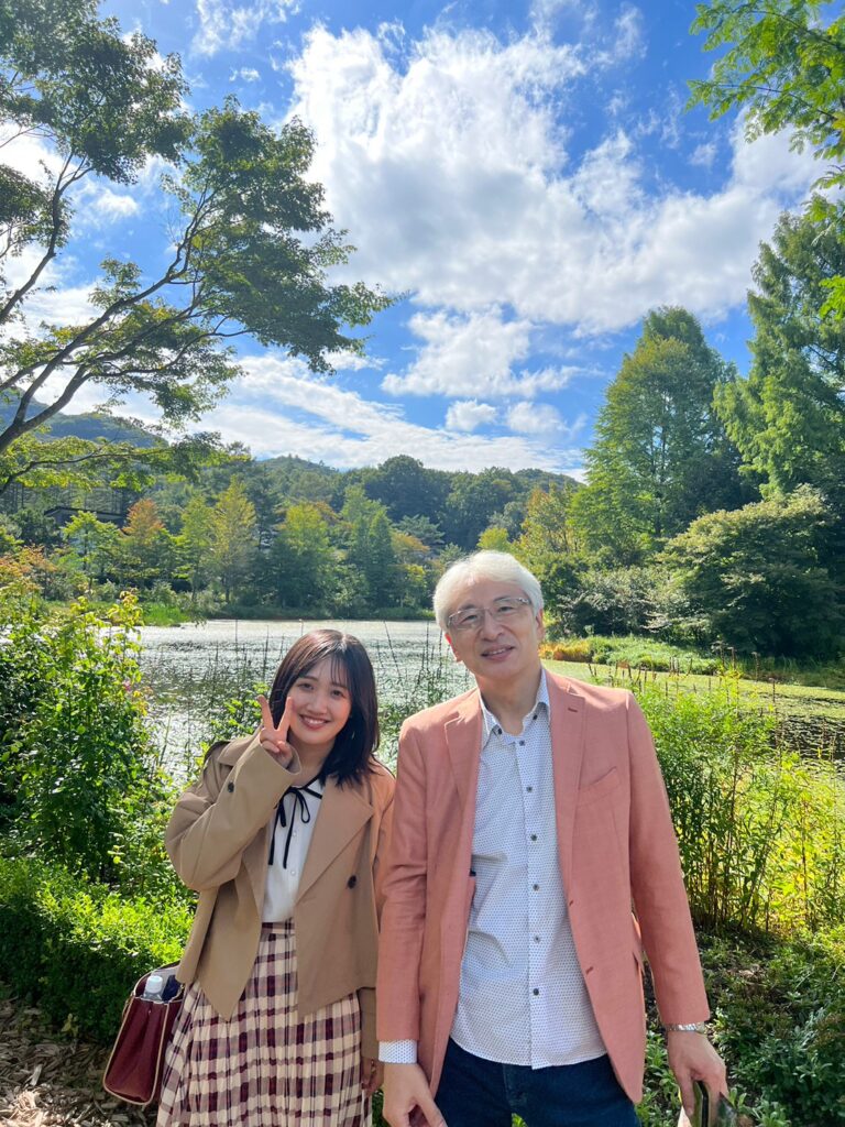 写真は「軽井沢レイクガーデン」で、バラなどのお花がたくさん池のまわりにあり、とてもきれいな所でした。みんなで散策しました。写真は私と先生ですが、先生が景色を見て「天国はきっとこんなところなんだろうなぁ。」とつぶやいていたので、「まだまだ元気で長生きしてほしい。」とゼミ生一同強く思いました。ここの喫茶店はスコーンが美味しいらしく、みんなでスコーンや美味しい紅茶を飲んだりしましたが、山田先生はなぜかキャロットケーキを美味しそうに食べていました。その後、アウトレットに戻り、旧軽井沢の軽井沢銀座までみんなで散歩をしながら夜は山田ゼミ御用達(!?)のハンバーグステーキのお店で、みんなで夕食を食べました。軽井沢は美味しいものもたくさんあります。シャインマスカットのパイがあったのですが、とっても美味しかったです!