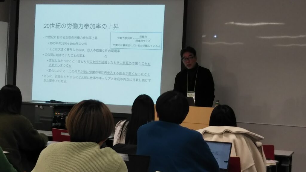 その後は教室を移動し、今度は瀧澤先生に今年の「ノーベル経済学賞」についての講義がありました。今年は女性の経済学者(クラウディア・ゴールディン教授)が男性と女性の賃金格差などの労働問題で受賞しているので、女子大の私たちにとっては大変勉強になる講義でした。大変興味が湧いたので、ゼミで著書を購入し、みんなで読んでみることになりました。