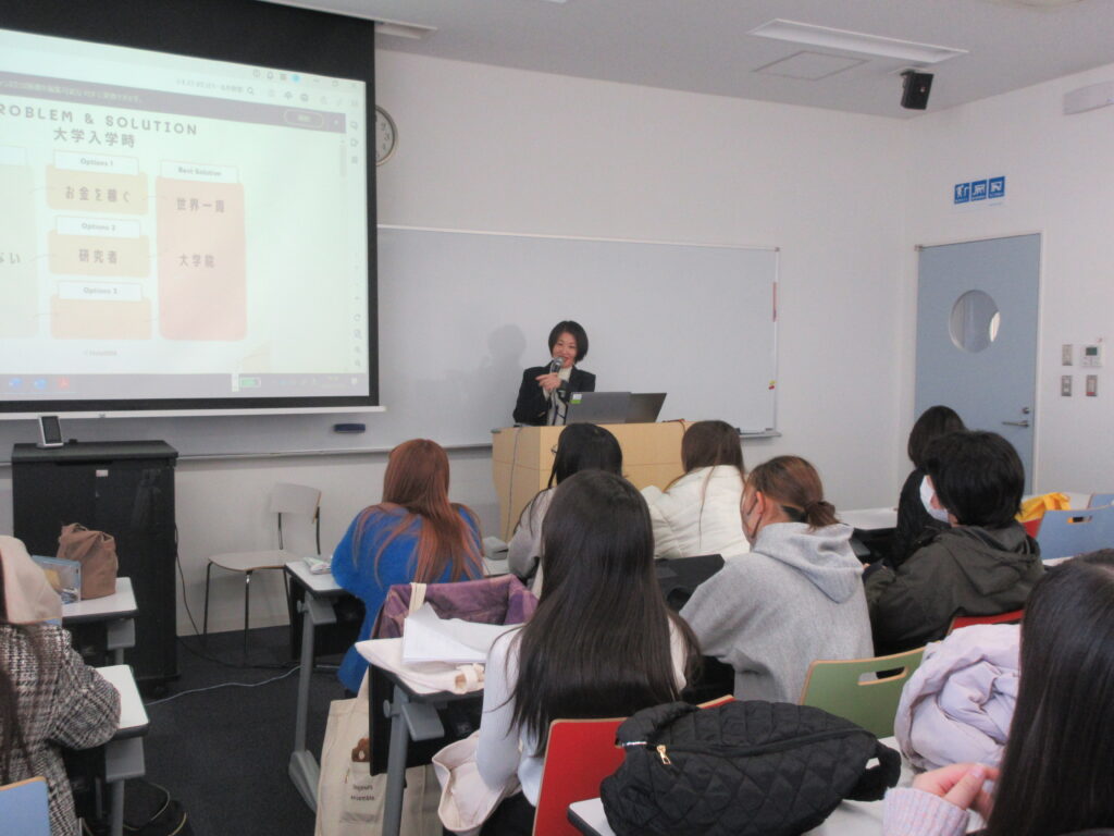 11/29(水)の10:40~12:10、会計ファイナンス学科キャリア支援部委員の加納先生主催、学科独自のメンターカフェ「アントレプレナーシップを考える」を開催し、1年生約100名が出席しました。