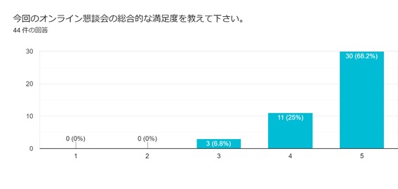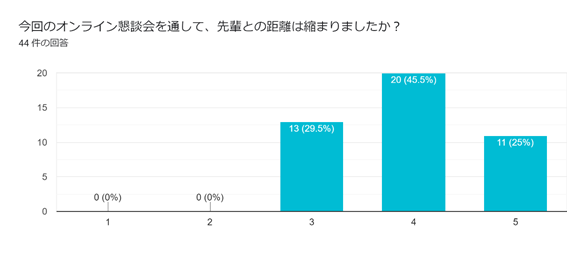 懇談会実施の結果、以下のグラフにも示されているように、新入生は現在抱いている新生活に対する不安が軽減され、また上級生との距離も近くなったようです。さらに全体の満足度も非常に高く、外出が難しく直接人と接することが困難な状況において、この懇談会は一定の役割を果たしたのではないかと感じています。