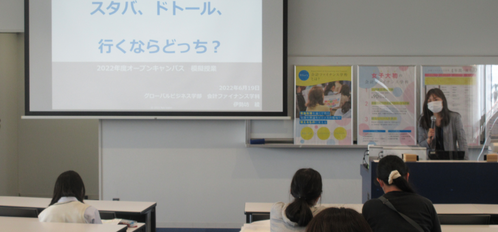6月19日(日)にオープンキャンパスが開催されました。学科長による会計ファイナンス学科の説明に加え、高校生の来場者の皆様には「体験授業」がありました。実際に、大学での授業に定評のある先生が模擬授業をしてくれます。今回はこの4月に会計ファイナンス学科に着任された伊勢坊先生が体験授業を担当してくれました。