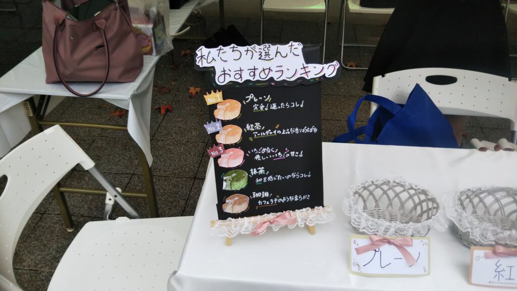 11月11日(土)、12日(日)で秋桜祭(学園祭)が開催されました。山田ゼミ3年は西武信用金庫様の物産展で取材をしたシフォンケーキのお店コボコボ様のシフォンケーキを販売しました。プレーン、紅茶、いちごみるく、コーヒー、抹茶の5つの味のシフォンケーキを販売しました。大変好評で、完売することができました。ご来場いただいた皆様、ご購入いただいた皆様、誠にありがとうございました。また、山田ゼミをご卒業された先輩方も数多く来て頂きました。ありがとうございました。コボコボ様のシフォンケーキは独自の製法と配合で小麦の使用を極力減らし、生クリーム無しでもしっとりフワトロな食感を実現した甘さ控えめのものです。